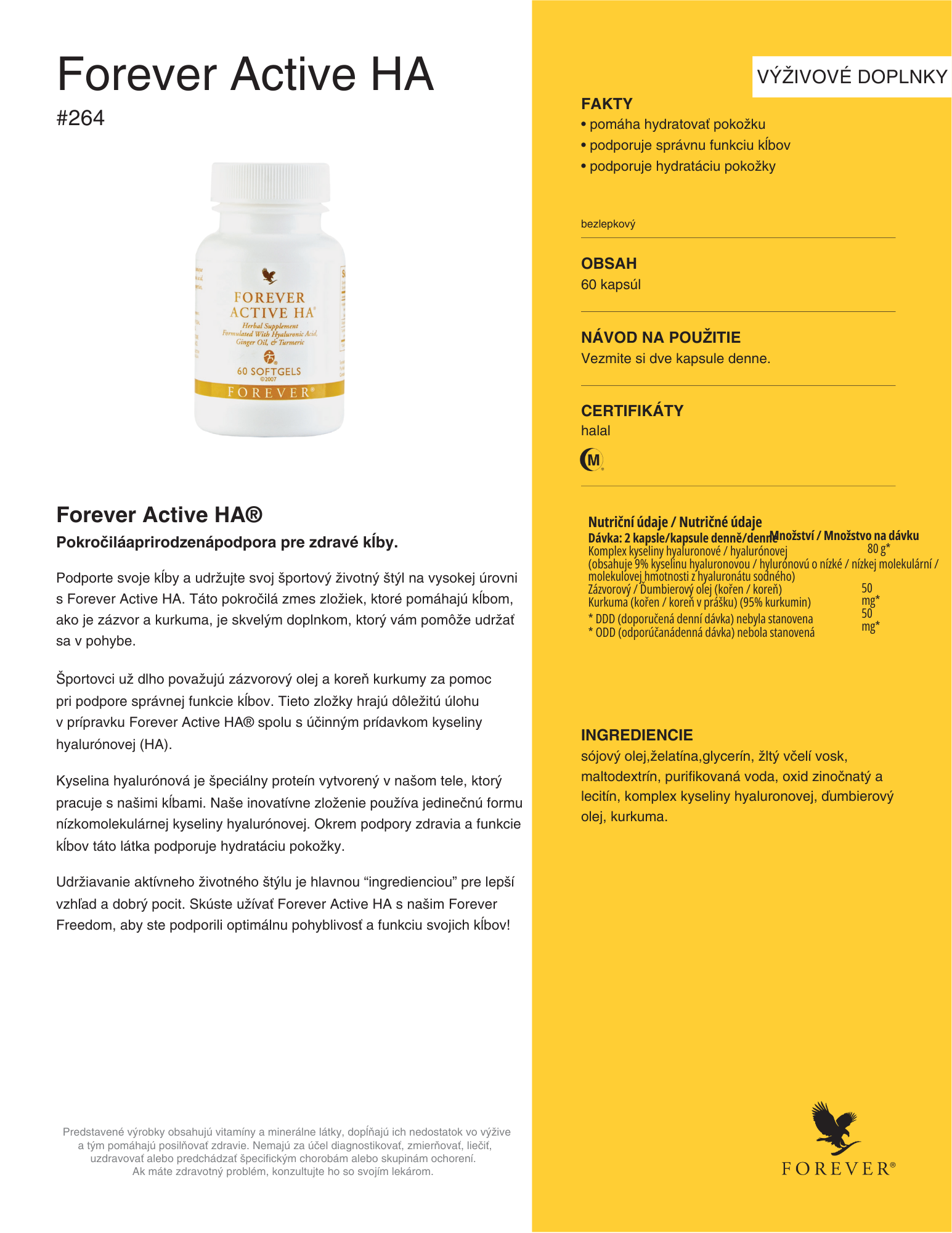 Podporte svoje kĺby a udržujte svoj športový životný štýl na vysokej úrovni s Forever Active HA. Táto pokročilá zmes zložiek, ktoré pomáhajú kĺbom, ako je zázvor a kurkuma, je skvelým doplnkom, ktorý vám pomôže udržať sa v pohybe.