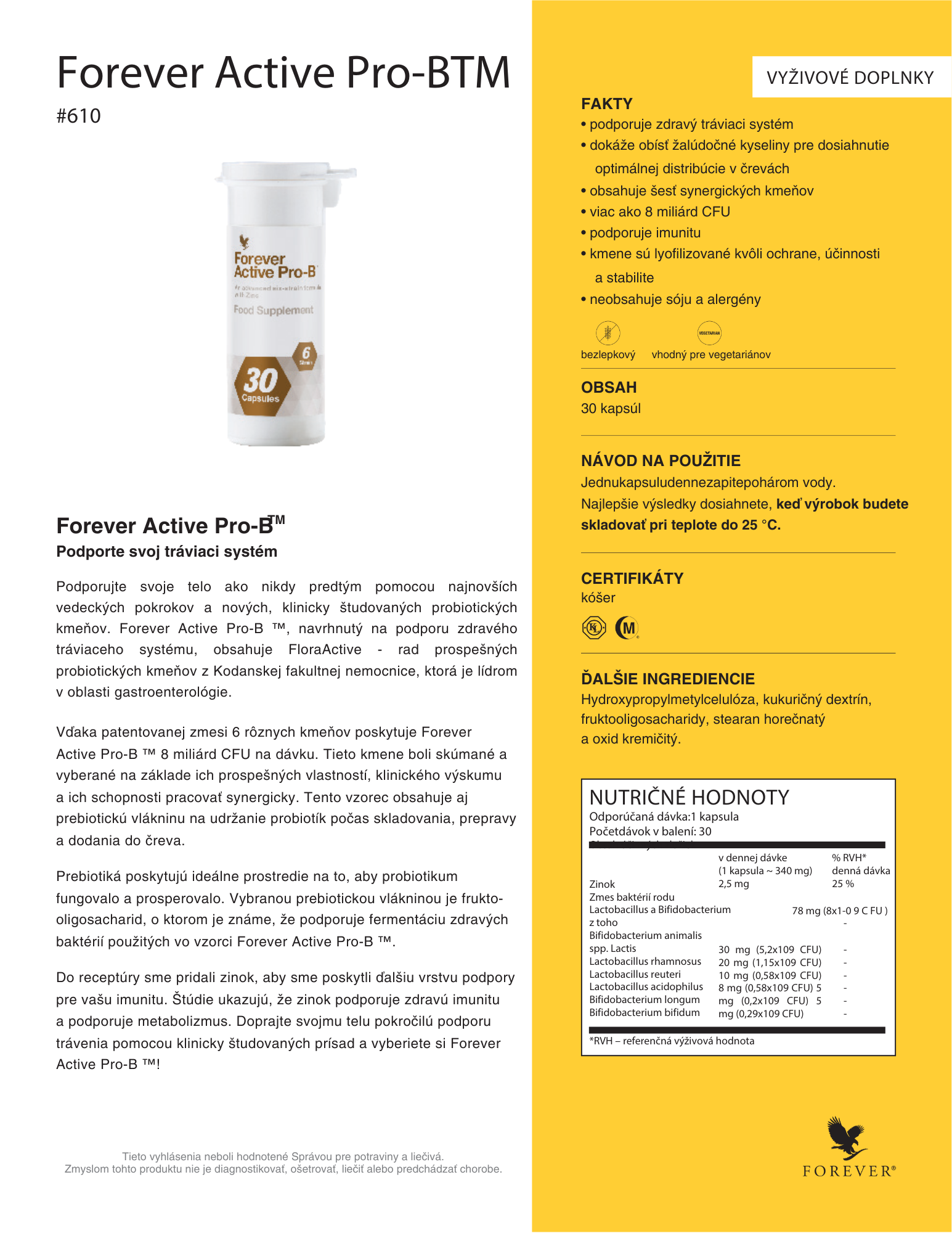 Vďaka patentovanej zmesi 6 rôznych kmeňov poskytuje probiotikum Forever Active Pro-B 8 miliárd CFU na dávku. Tieto kmene boli skúmané a vyberané na základe ich prospešných vlastností, klinického výskumu a ich schopnosti pracovať synergicky. Probiotiká obsahujú aj prebiotickú vlákninu na udržanie probiotík počas skladovania, prepravy a dodania do čreva.