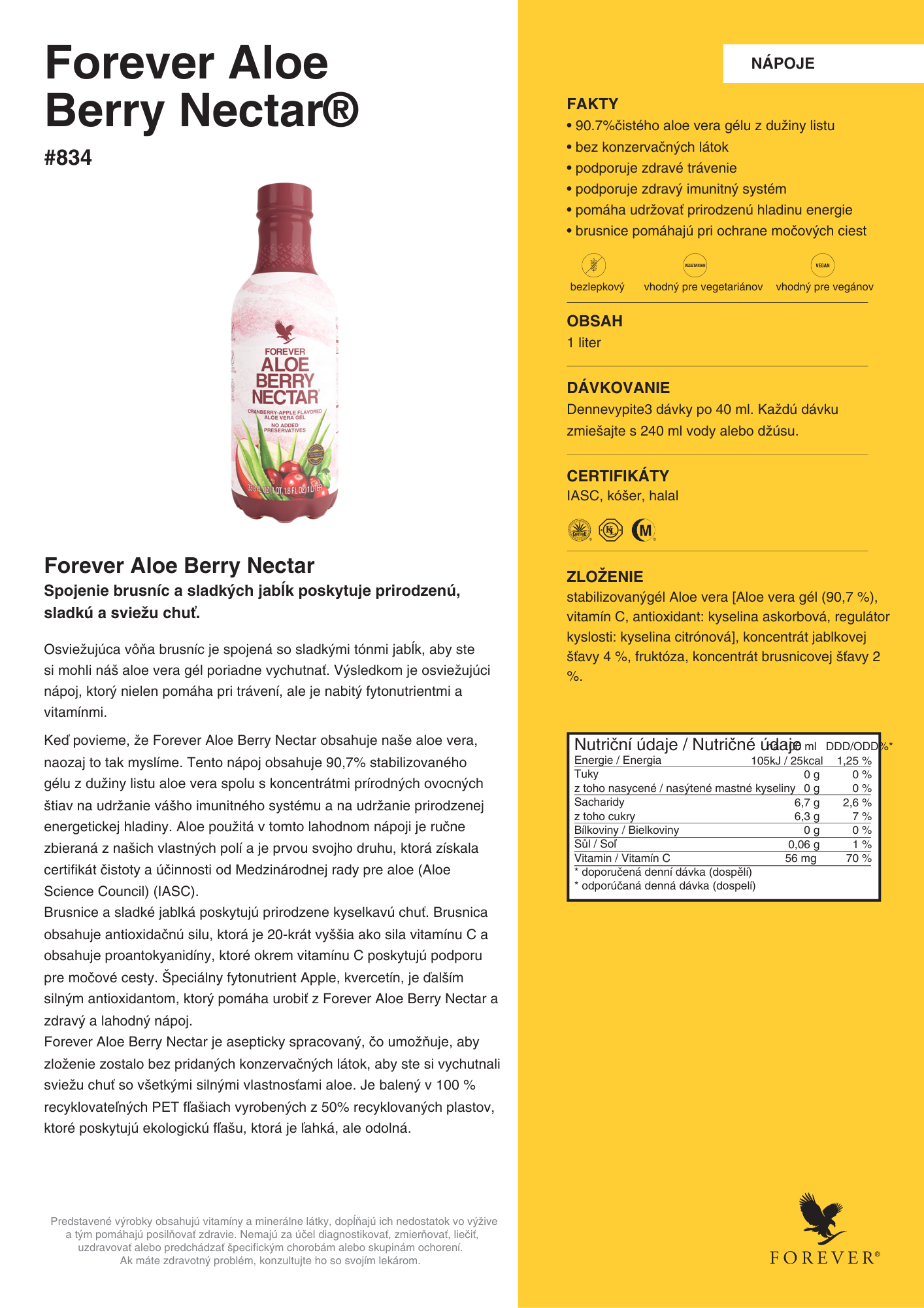 Keď povieme, že Forever Aloe Berry Nectar obsahuje naše aloe vera, máme to na mysli. Tento nápoj obsahuje 90,7% stabilizovaného gélu z aloe vera z vnútorných listov spolu s koncentrátmi prírodných ovocných štiav na udržanie vášho imunitného systému a na udržanie prirodzenej energetickej hladiny. Aloe použitá v tomto lahodnom nápoji je ručne zbieraná z našich vlastných polí a je prvou svojho druhu, ktorá získala certifikát čistoty a účinnosti od Medzinárodnej rady pre aloe (Aloe Science Council) (IASC).