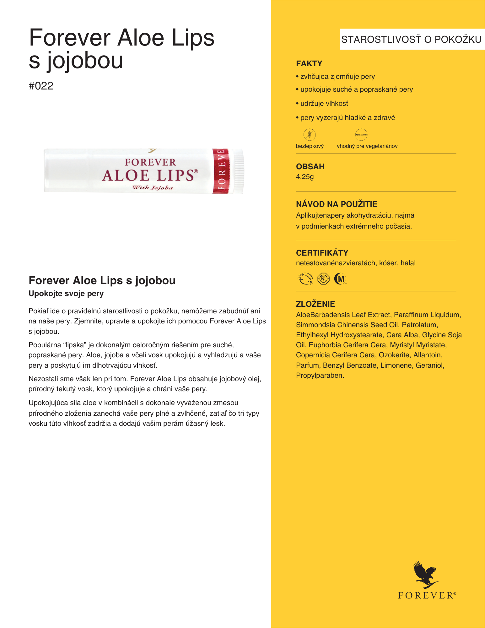 Nezostali sme však len pri tom. Forever Aloe Lips obsahuje jojobový olej, prírodný tekutý vosk, ktorý upokojuje a chráni vaše pery.