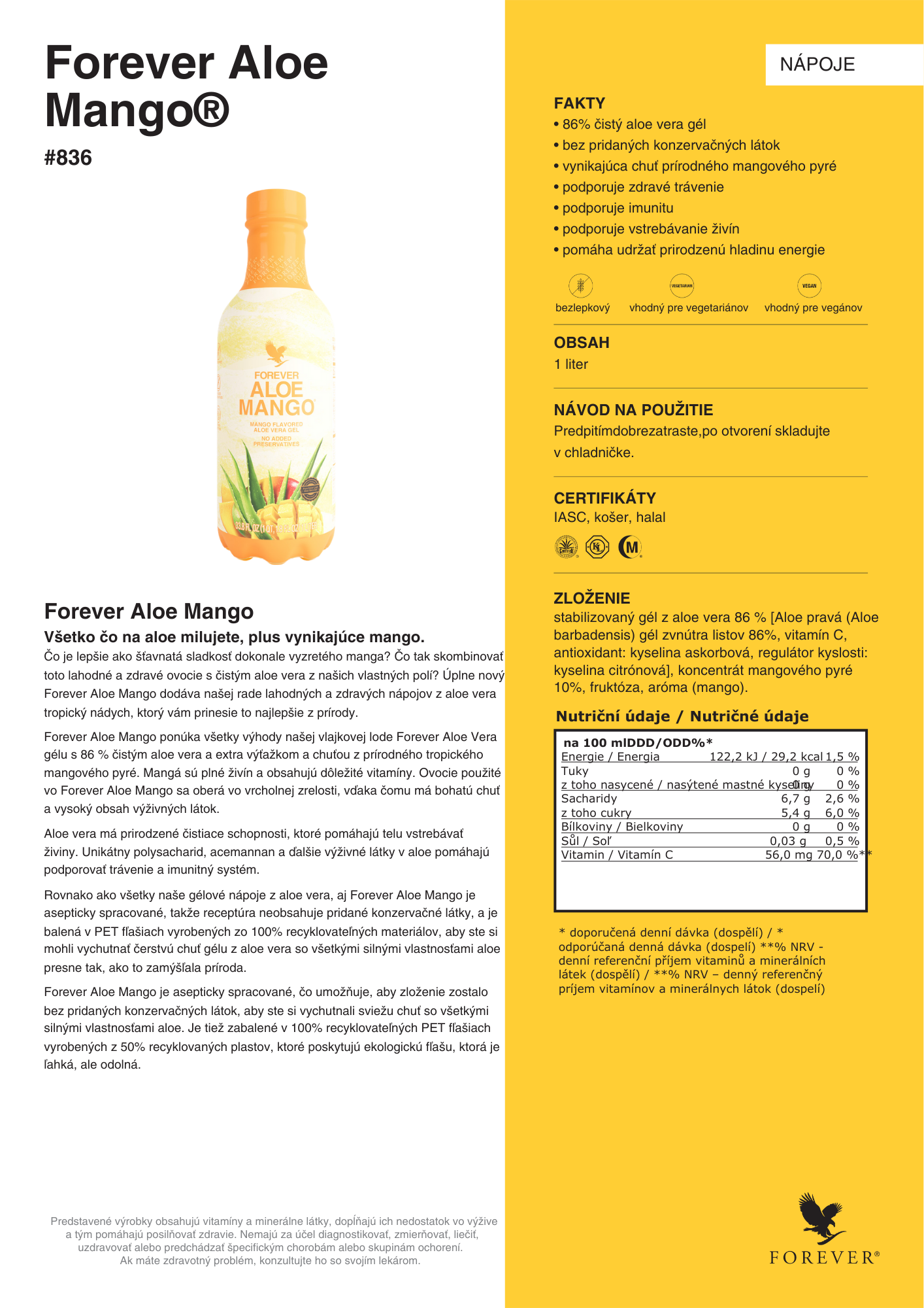 Forever Aloe Mango ponúka všetky výhody našej vlajkovej lode Forever Aloe Vera gélu s 86 % čistým aloe vera a extra výťažkom a chuťou z prírodného tropického mangového pyré. Mangá sú plné živín a obsahujú dôležité vitamíny. Ovocie použité vo Forever Aloe Mango sa zberá vo vrcholnej zrelosti, aby sa zabezpečilo, že bohatá chuť a obsah výživných látok dosiahnu správnu hladinu.